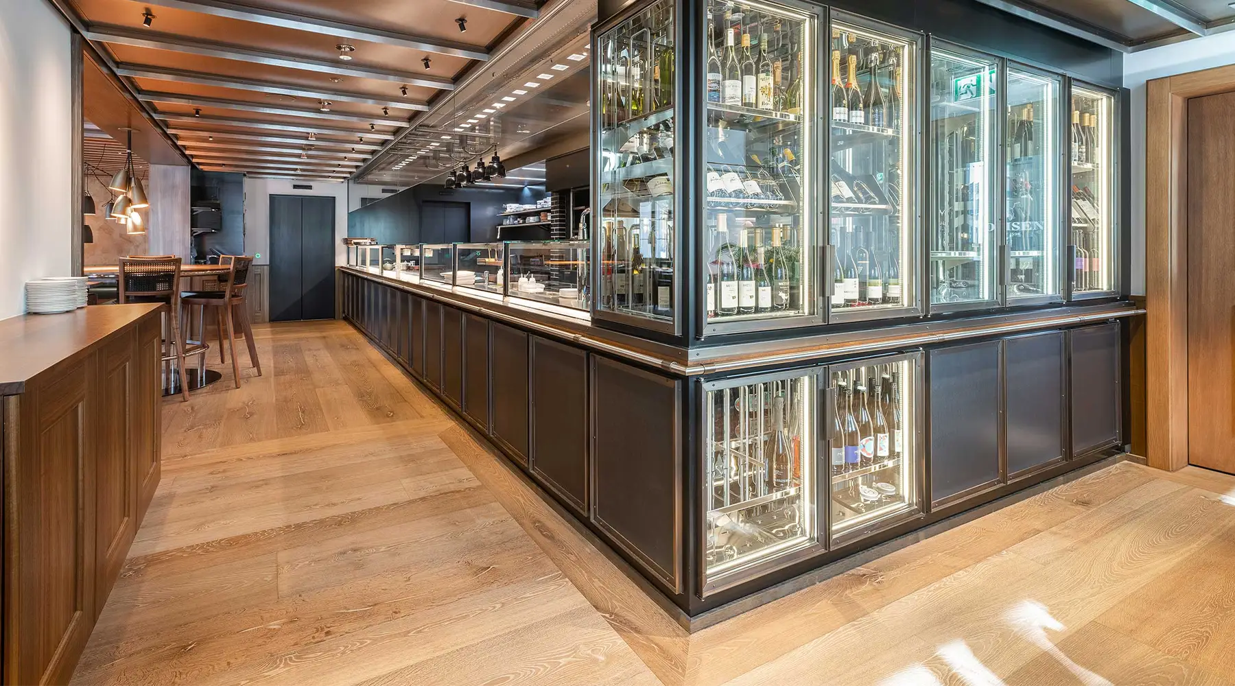 Detailplanung der Buffetanlage nach Vorgaben des Fachplaners und der Architektin. Entwicklung und Detailplanung der speziell angefertigten Weinklimaschränke und Fleischkühlvitrinen.