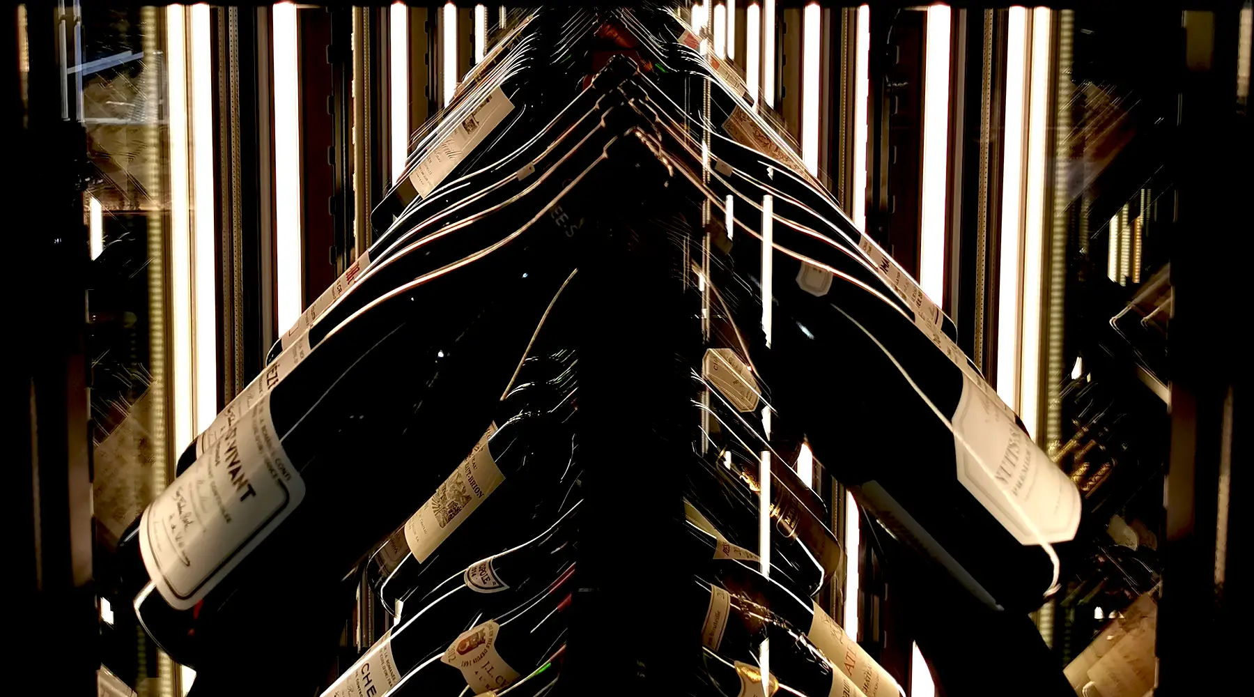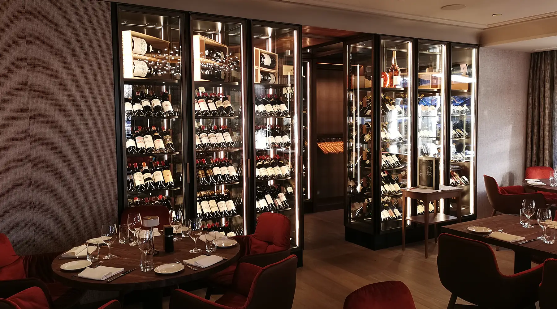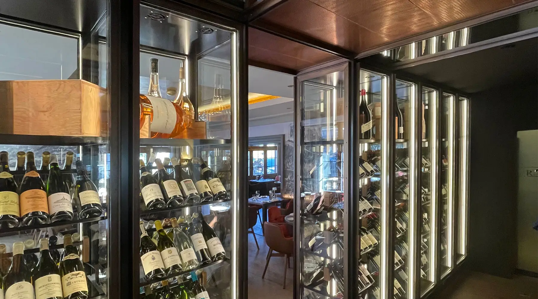 Detailplanung der 14 Weinklimaschränke, alle mit eigenen Temperaturzonen. Ausführung aus exklusiven, bronzierten Profilen.